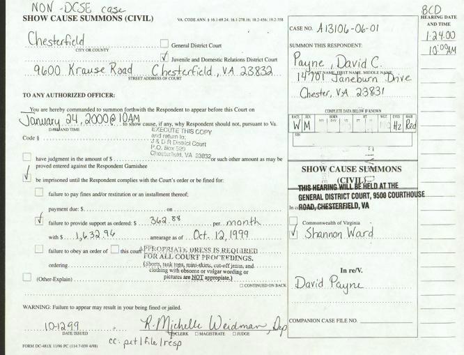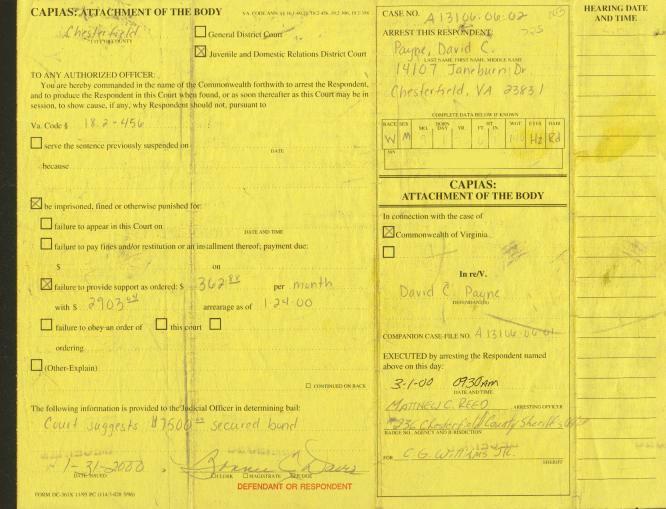 Well it sure was the beginning. Below you will find a Show Cause filed by my wife against me for non-payment of child support, that I was never served with due to the wrong address . Below it you will see the Capias that Judge Bonnie Davis issued knowing I was never served, therefore never giving me the opportunity to defend myself. Notice the addresses on both. When Judge Davis wrote the Capias, "SHE" corrected the address that was incorrect on the Show Cause. When a Show Cause was issued on the mother some time previous, and was unable to be served due to the mother moving before it arrived, Judge Davis through it out saying I must refile with the correct information. Again another true sign of the bias displayed during this case. Also it defies belief that the Show Cause was issued with the wrong address being the Court Order it applies to has my current address, for seven years, written twice, giving thoughts that it was done this way on purpose for the results it briefly obtained, and in attempts to defame me.